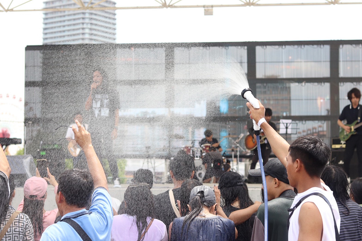 開会に際し当会理事長の呼びかけで、今年3月28日に発生したミャンマー地震の犠牲者を悼み、1分間の黙とうを捧げました。そのあとステージでは、民族衣装をまとっての舞踊やバンド演奏による歌が披露され、音楽フェスティバルさながらにリズムにのって楽しむ観客の頭上から、シャワーの水が降りそそいでいました。